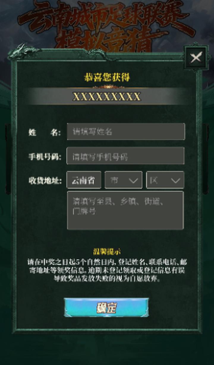 1、获得实物奖品的用户,请务必于中奖之日起5个自然日内,在指定页面完成手机号、姓名及云南省内有效邮寄地址的登记,逾期视为自动放弃,所有实物奖品预计于5月份统一安排邮寄,请您中奖后耐心等待。