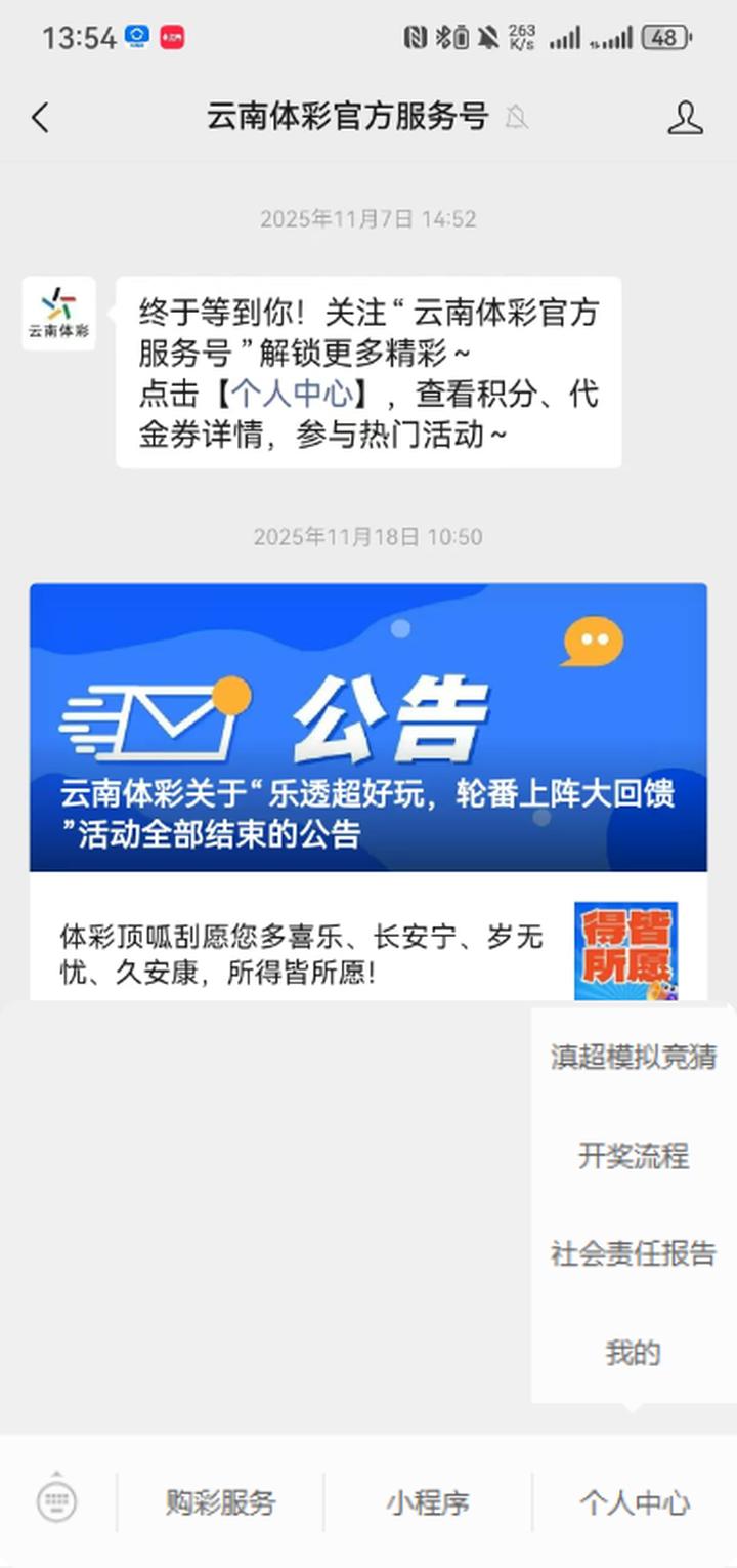 方式二:搜索并关注“云南体彩官方服务号“,点击菜单栏“个人中心”→“滇超模拟竞猜”进入活动。