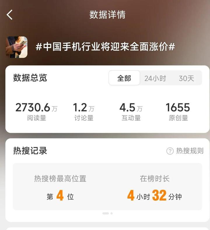 2月26日,“中国手机行业将迎来全面涨价”相关话题登上微博热搜榜,最高位居热搜第4位,相关阅读量达2730.6万,引发网友广泛关注。事实上,在2026年初,“内存条价格超越黄金”等相关话题曾登上热搜榜第2位,内存条涨价引发的连锁反应正从上游供应链蔓延至手机卖场。