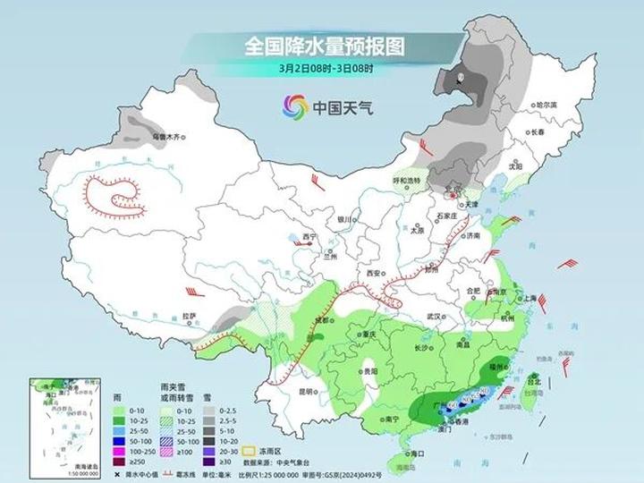 今明两天(3月1日至2日),我国雨雪范围较大,北方多地将现较强降雪,江南、华南降雨频繁,部分地区仍有中到大雨,局地暴雨,公众出行请留意交通安全。