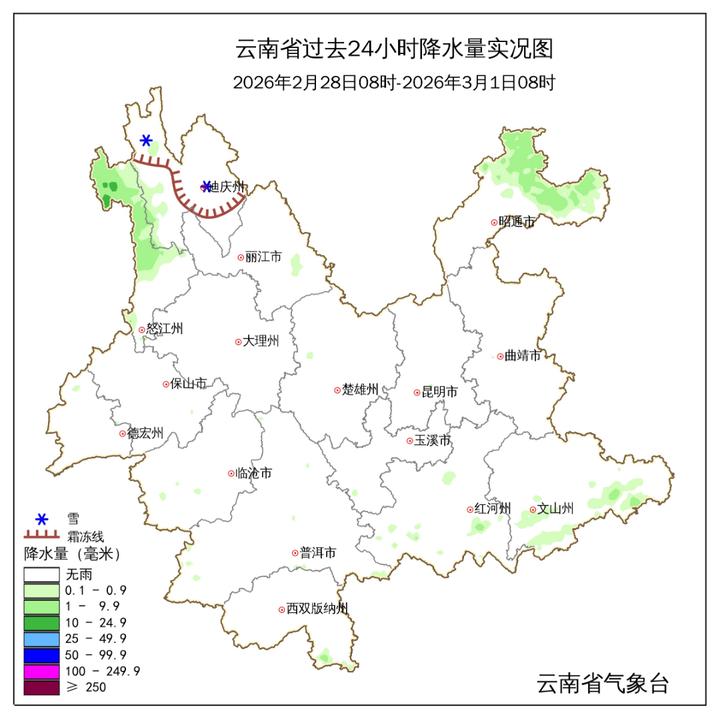 怒江州中北部、迪庆州北部、昭通市北部、文山州南部、红河州东南部出现小雨局部中雨,其中香格里拉市、德钦县出现降雪。全省累计降水量10~25毫米的有5站(最大为贡山县独龙江乡马库站19.7毫米)、0.1~10毫米的有467站(占总站数8%)。清晨南部局地出现大雾。午后中北部和东南部局地出现阵性大风。