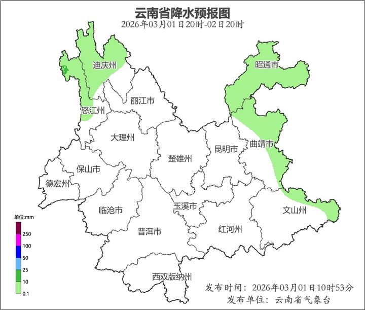 3月1日20时到3月2日20时:昭通市、曲靖市东部、文山州东部多云间阴有小雨,怒江州、迪庆州多云有阵雨局部中雨,其中,迪庆州北部山区有雨夹雪或小雪,其他地区晴间多云。