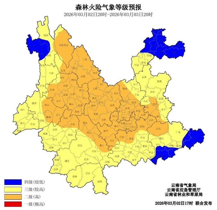 预计3月2日20时至3月3日20时,迪庆州东部、丽江市、大理州、保山市东部、临沧市北部、普洱市北部、楚雄州、昆明市西南部、玉溪市、红河州北部、曲靖市西南部、文山州西北部二级(高),迪庆州西部、怒江州中南部、保山市西部、德宏州、临沧市南部、普洱市南部、西双版纳州、红河州中南部、昆明市东北部、昭通市中南部、曲靖市东北部、文山州中部三级(较高),其他地区四级(较低)。