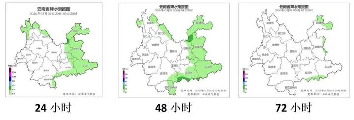 3月3日20时到3月4日20时:昭通市、曲靖市、昆明市东部、文山州、红河州大部、普洱市东南部、西双版纳州东部、怒江州北部、迪庆州北部、丽江市北部多云间阴有小雨局部中雨,其他地区晴间多云。