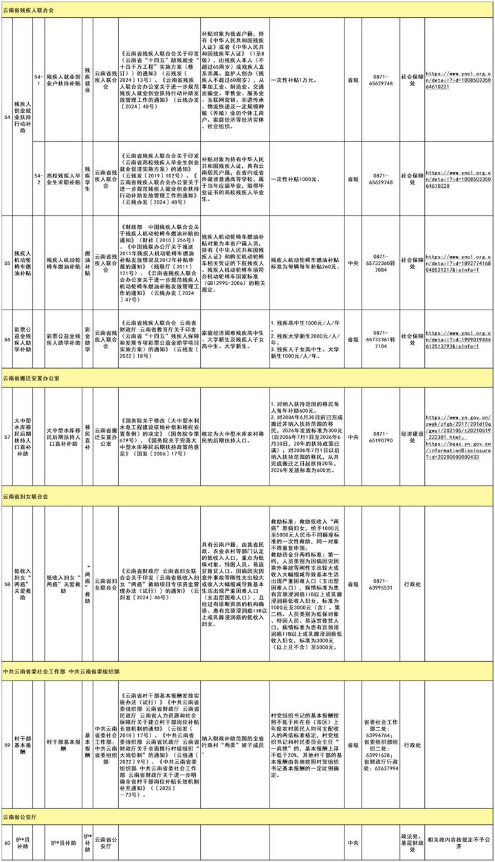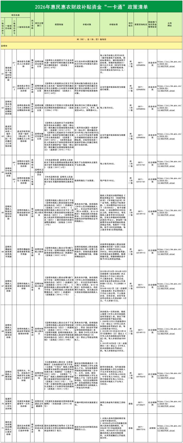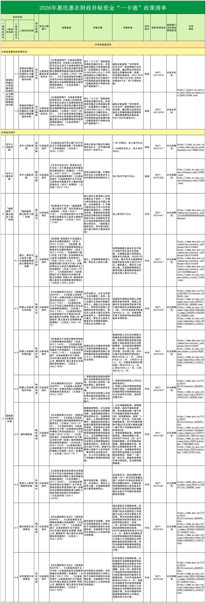 根据《云南省惠民惠农财政补贴资金“一卡通”管理工作方案》要求,云南省各级各部门梳理形成《2026年惠民惠农财政补贴资金“一卡通”政策清单》,云南省财政厅予以公布。