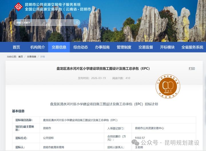 3月19日,昆明市公共资源交易平台发布“盘龙区清水河片区小学建设项目施工图设计及施工总承包(EPC)”招标计划,项目合同估算价为9302.57万元。