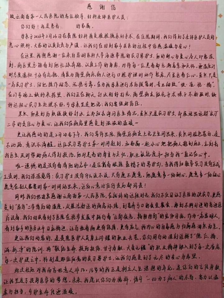 患者家属给张梵的感谢信。新华网发(张梵 摄)