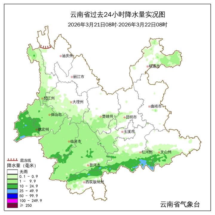 德宏州、普洱市东南部、西双版纳州北部、红河州南部、文山州西南部出现中雨局部大雨,昭通市东部、怒江州、大理州西部、保山市、临沧市、普洱市中北部、红河州中部出现小雨局部中雨,其他地区出现分散阵雨。