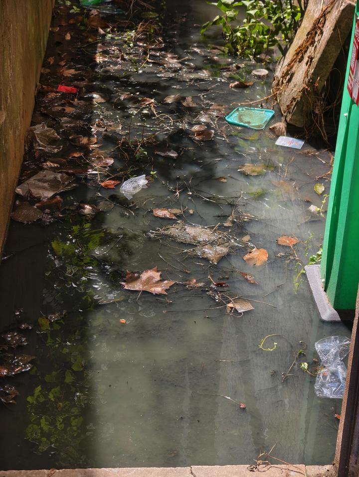 23日13时30分,记者来到位于虹山东路274号临街的4栋。该楼栋建在山坡上,南侧有一条约2米宽、15米长的小巷道被黑色污水完全淹没,水深约10厘米,下方为阴沟盖板,其间不断有气泡冒出。积水呈黑褐色,有腐臭味,水面漂浮着枯黄树叶、塑料饭盒、饮料瓶及垃圾袋等。居民王先生表示:“雨季将至,高温下这些污水更容易滋生细菌,对居民健康影响很大。”