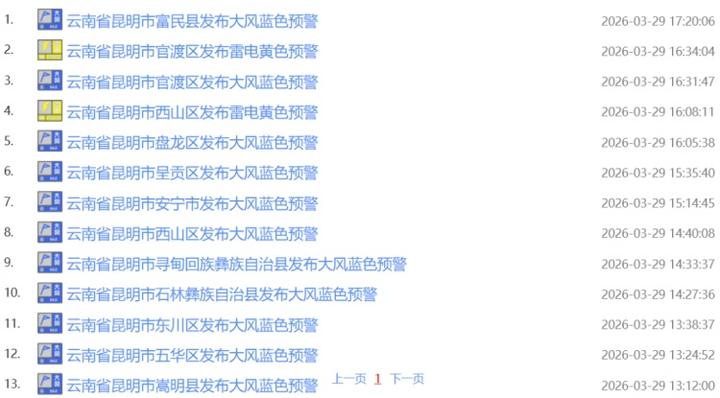 据昆明市气象台官方微博@昆明气象 消息,昆明市气象台2026年03月29日16时45分发布大风Ⅳ级预警:预计未来12小时,五华、盘龙、官渡、西山、呈贡、晋宁、安宁、寻甸、嵩明、宜良、石林、富民、禄劝、东川将出现阵风9级以上的大风,相关部门做好防大风工作,刮风时公众不要在广告牌、临时搭建物下逗留。
