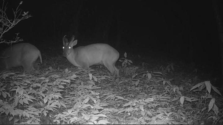 此外,红外相机还记录到了四只国家二级保护动物白鹇和一只可爱的小松鼠同框觅食的和谐景象,两只猕猴打斗、数只黄喉貂追逐激斗的热闹场景,以及赤麂甜蜜约会的瞬间。