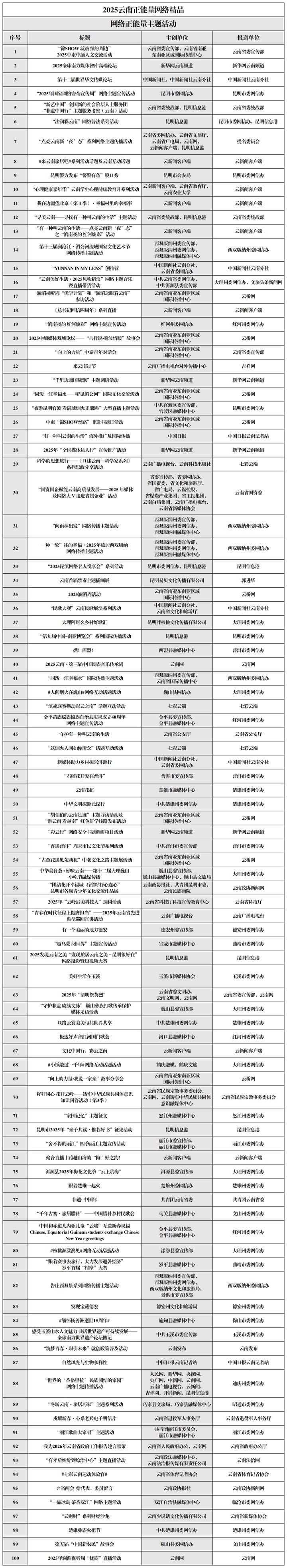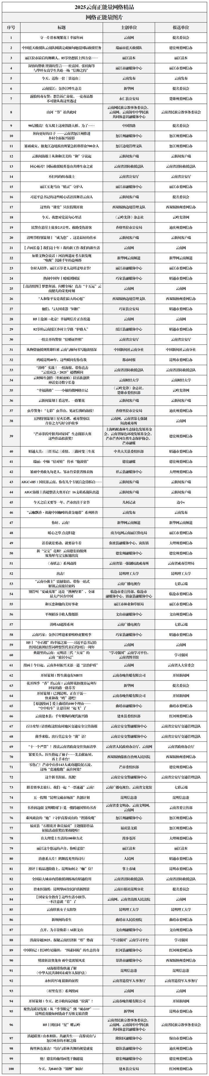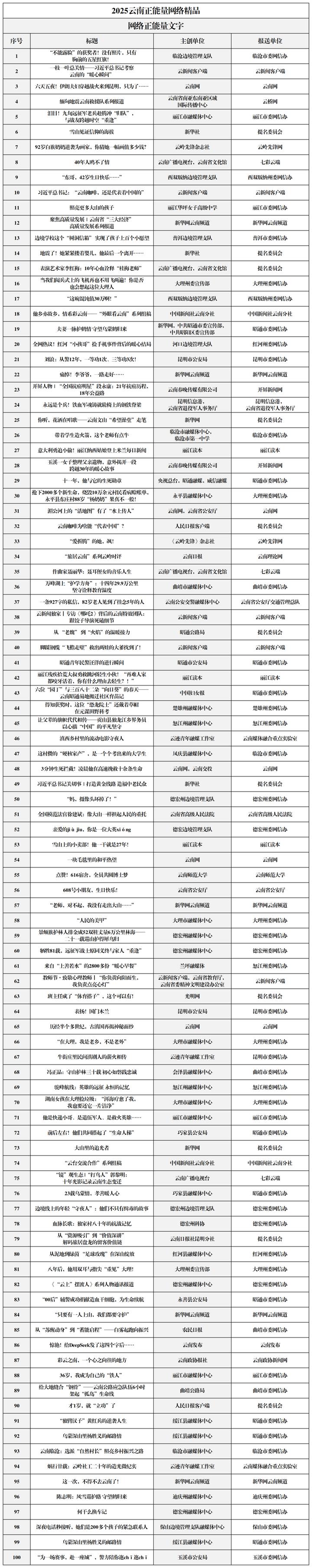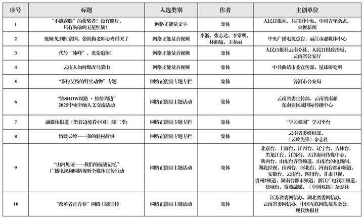 为做大做强网上正面宣传的声量、流量,云南省同步开展了2025云南正能量网络精品征集展播活动,发掘和推出了515件有温度、有力量、有影响力的云南网络正能量精品。现将名单一并公布。