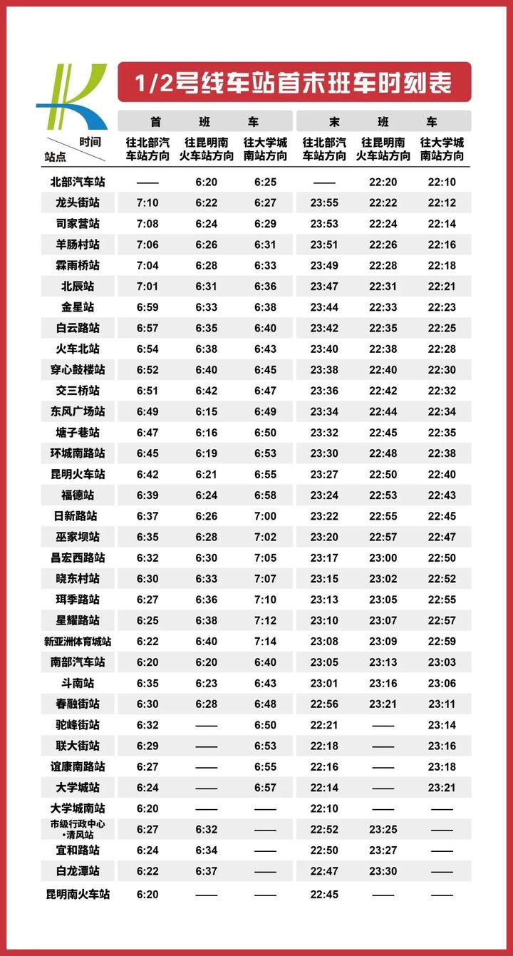 北部汽车站、白云路站、东风广场站、环城南路站、昆明火车站、珥季路站、南部汽车站、斗南站、春融街站、大学城站、五一路站、昆明南火车站、圆通山站
