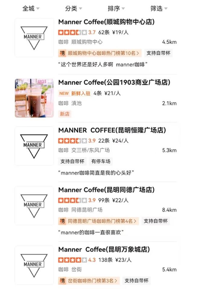 开屏新闻小编查询相关平台发现,Manner目前在昆明有5家门店。