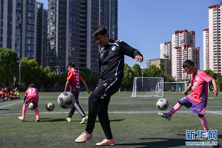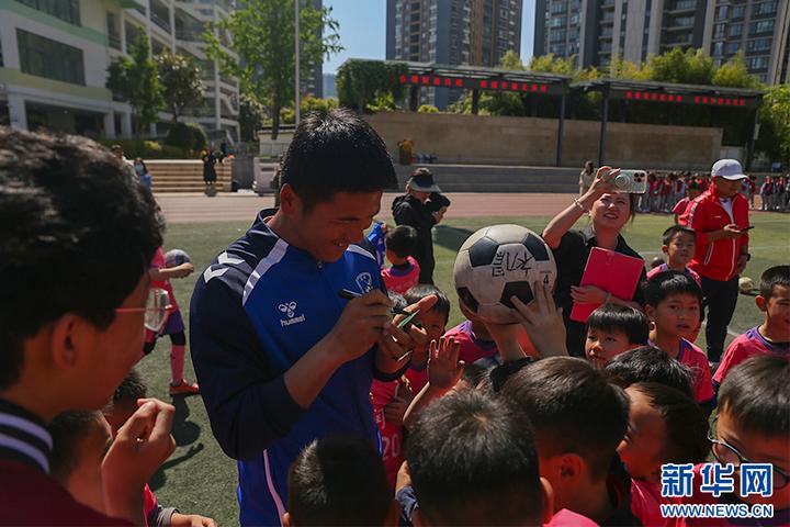 昆明队球员沈辑星与小学生展开“颠球比赛”(4月3日摄)。新华网发(杨桢宇 摄)