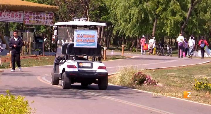 白色的无人驾驶观光车沿着绿道缓慢行驶,车身小巧精致,在滇池边的湖光山色中成为一道别样的风景。