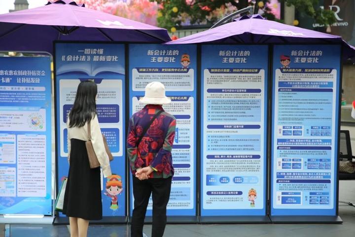 活动现场,一排深蓝色宣传展板在南屏步行街广场整齐排开,吸引了大批市民驻足。展板通过新旧条款对比、图表解析等方式,生动解读了新会计法关于加强会计监督、加大追责力度等核心变化,将专业法律条文转化为通俗易懂的财经常识。