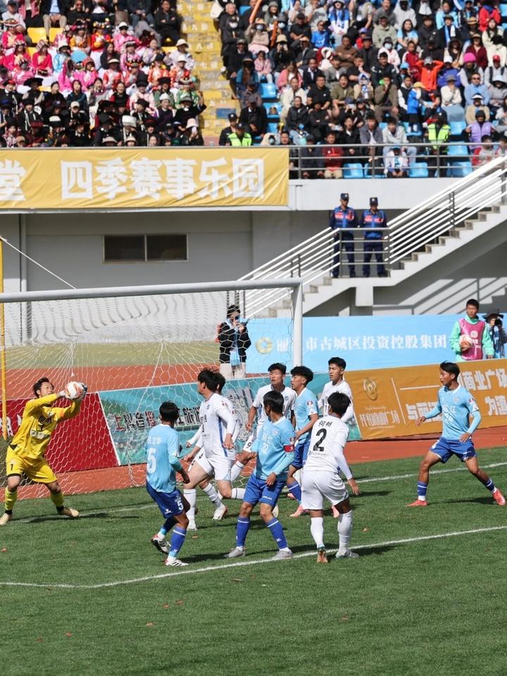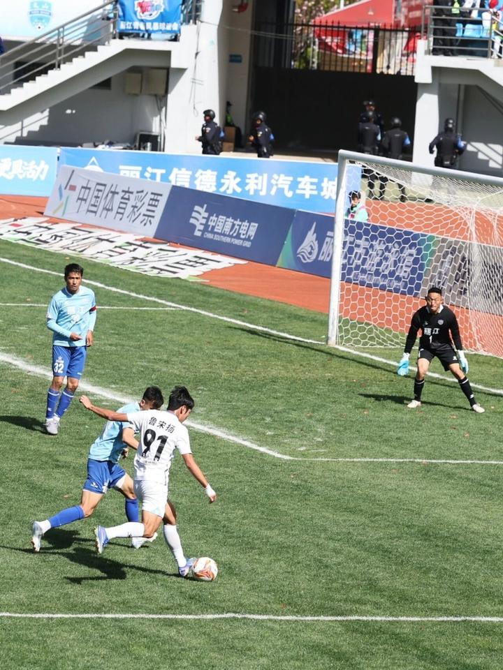 比赛一开始,双方都没有把节奏提得太快,场上形势也比较胶着,彼此都在试探如何打开局面。第6分钟,丽江队率先用一脚远射考验了昆明队门将李逸豪。第16分钟,昆明队也在禁区边缘完成第一脚射门。整个上半场,两队均未能创造出绝佳的进球良机,以0比0的比分进入中场休息。下半场易边再战,昆明队换上沈辑星和蔡青恒。第49分钟,丽江右路传中在昆明队禁区制造混乱,皮球险些滚进球门。第54分钟,丽江队连续利用定位球机会威胁昆明队球门,都被昆明队门将李逸豪神勇化解。第76分钟,丽江队禁区外射门,昆明队门将李逸豪倒地尽力将球扑出,但丽江队老将高福荣及时补射将球打进,帮助丽江队1比0领先。此后,昆明队全力组织反击,但未能扳平比分,最终一球小负。