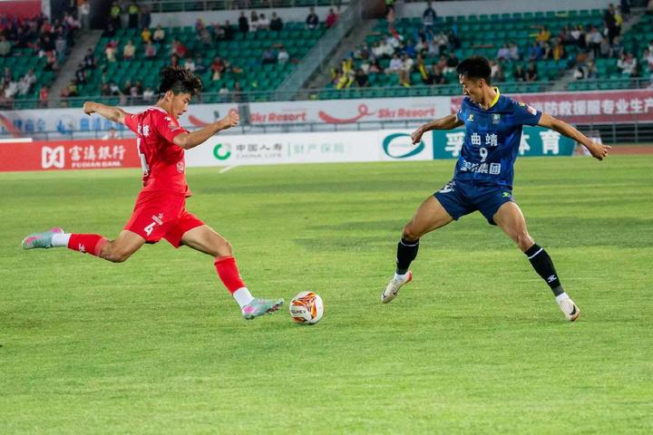 比赛哨声响起,双方没有过多试探,直接展开激烈对攻。第21分钟,曲靖队11号和董董率先撕开楚雄队防线,破门得分,为主队拿下开门红,将比分改写为1:0。主场球迷的欢呼声尚未平息,第27分钟,曲靖队66号张智超趁热打铁再下一城,比分迅速扩大至2:0,主队攻势势如破竹。