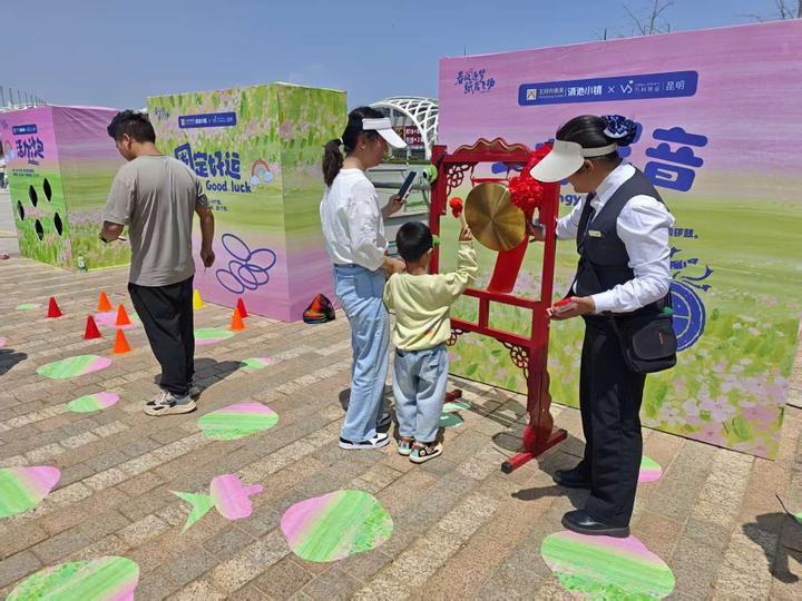 除了风筝放飞比拼,现场还设置了多重趣味互动关卡,让业主们在游戏中拉近距离、增进情谊。“圈定好运”套圈游戏前,小朋友们手持彩色套圈,瞄准目标抛出,每一次精准的套中都引来阵阵欢呼;“一击即中”敲锣打卡点,孩子们抡起小锤敲响铜锣,清脆的锣声里满是挑战成功的喜悦;百米长卷彩绘区更是人气爆棚,孩子们围坐在长桌前,用彩笔在画卷上勾勒出恐龙、小动物等充满童趣的图案,共同描绘出一幅充满想象力的春日长卷。