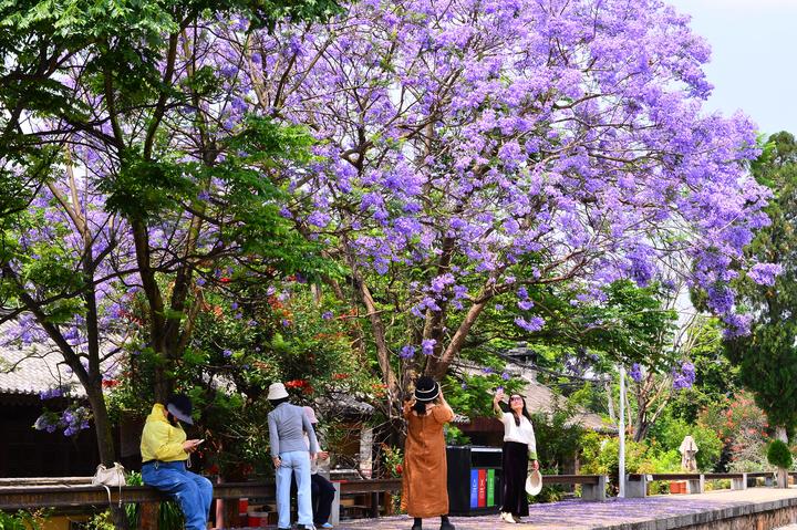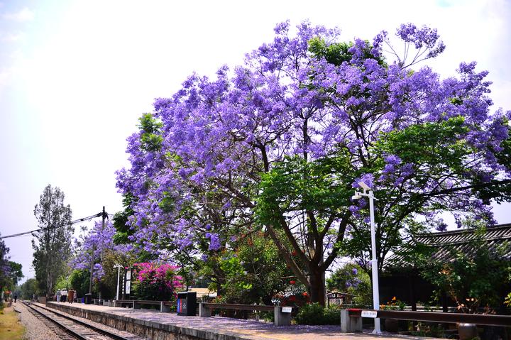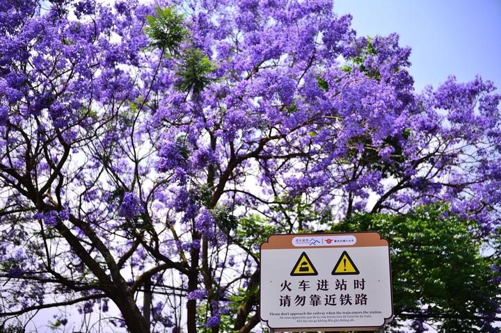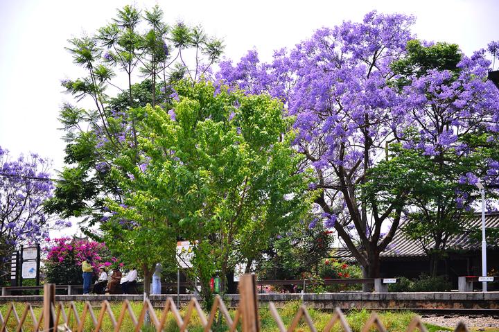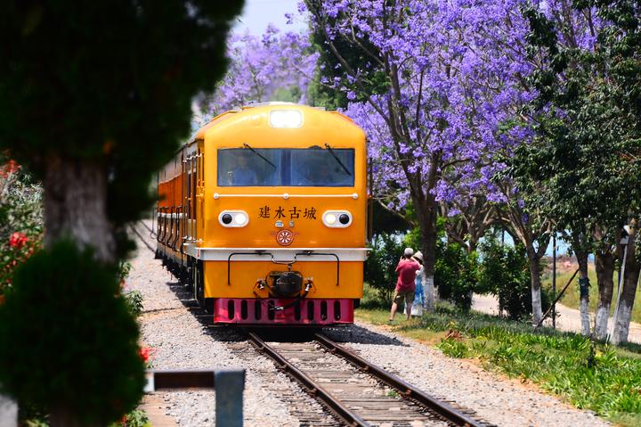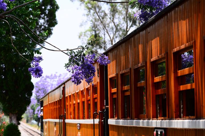 在云南省红河州建水双龙桥景区古城旅游小火车的临时停靠站,蓝花楹盛放如淡紫云霞。