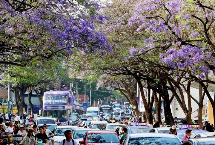 教场中路蓝花楹初放,整条街区人潮涌动、车水马龙。杨峥 摄