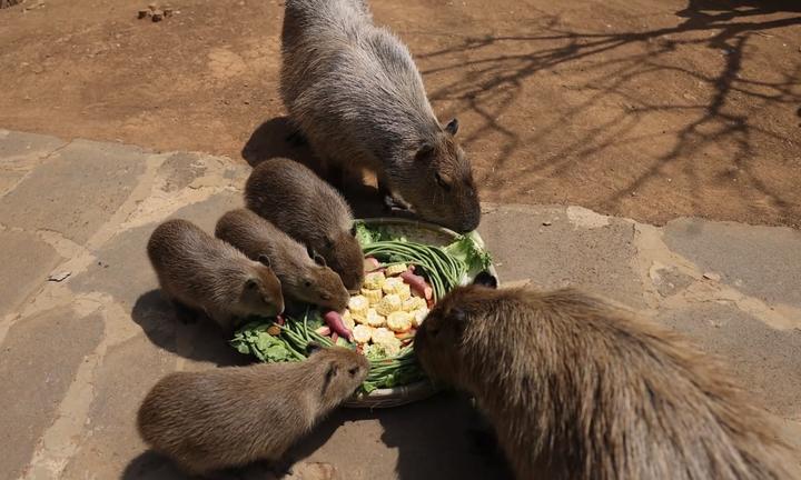 在萌宠乐园,五只水豚宝宝迎来了属于自己的高光时刻。园区借鉴民间“送祝米”的习俗,为水豚家族定制了特色祝米宴。保育员用竹筐盛满有机胡萝卜、玉米、红薯等水豚喜爱的食物,既满足了它们的食性,也承载了对新生水豚“五谷丰登、衣食无忧”的美好祝愿。