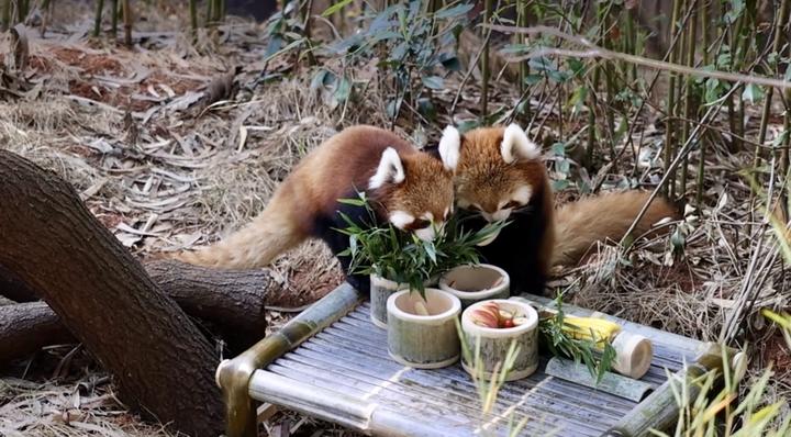 在云南秘境区,保育员结合云南少数民族特色与竹文化,为新加入的小熊猫成员打造了一场“竹筒餐”。除了提供营养丰富的定制竹筒餐,园区还准备了竹子制成的清凉夏用竹窝、竹床以及竹编玩具,用于环境丰容。小熊猫们在竹林雅韵中悠闲地进食、玩耍,沉浸式体验了一场充满民族风情的滇式迎新礼。