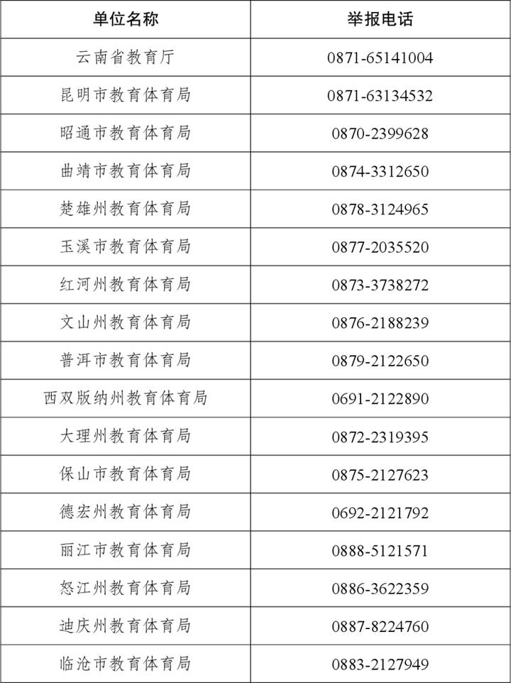 日前,省教育厅公布云南省中小学违规补课、违规收费投诉举报电话,充分发挥社会监督作用,进一步畅通广大师生、家长、社会公众投诉举报途径,规范全省中小学校办学管理,提升基础教育育人质量。