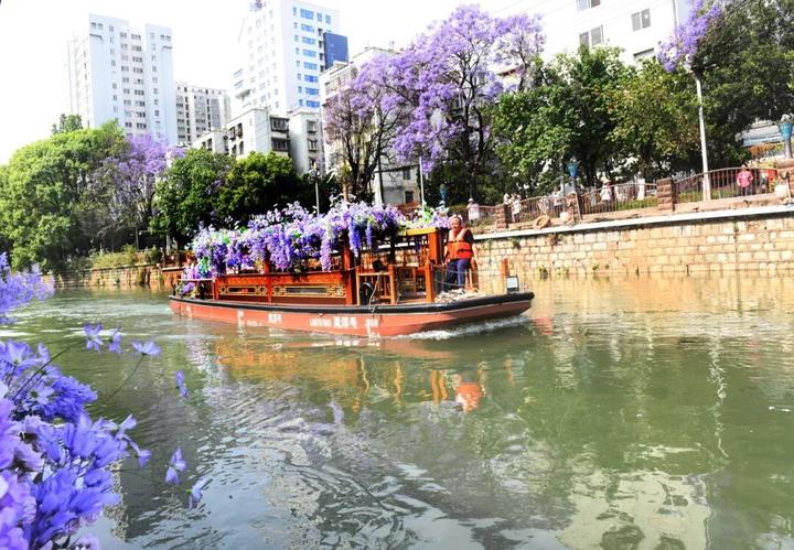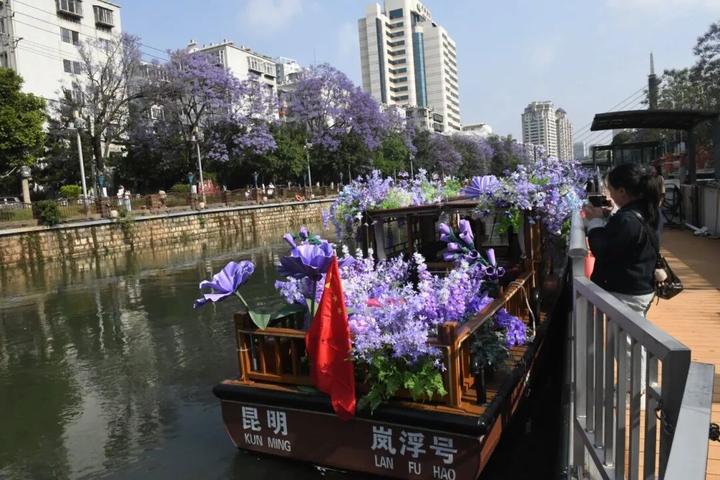 首航当日,不少市民游客早早来到码头等候,成为航线首批体验者。“平时都是在岸边散步看蓝花楹,第一次坐船从江上视角观赏,完全是不一样的感觉。”市民刘女士从网上得知开航的信息带着家人一同体验首航,全程满心欢喜,不断拍照记录美景。从广州前来游玩的外地游客张先生特意带着一家人前来打卡,“这个季节昆明的蓝花楹最美,这条航线把春城的春日韵味展现得淋漓尽致,坐在船上欣赏岸边的蓝花楹,又是不一样的体验,特别值得。”