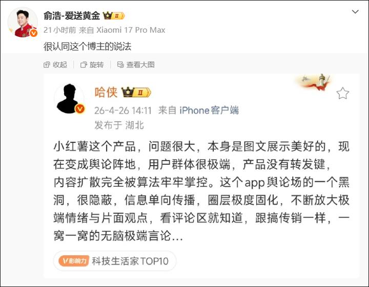4月26日,追觅科技创始人兼CEO俞浩连发三条微博炮轰小红书。
