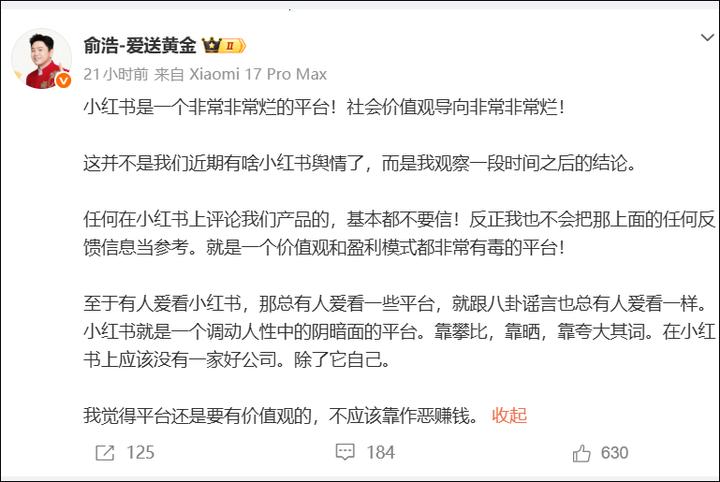 此外,俞浩补充说:“至于有人爱看小红书,那总有人爱看一些平台,就跟八卦谣言也总有人爱看一样。小红书就是一个调动人性中的阴暗面的平台。靠攀比,靠晒,靠夸大其词。在小红书上应该没有一家好公司。除了它自己。我觉得平台还是要有价值观的,不应该靠作恶赚钱。”