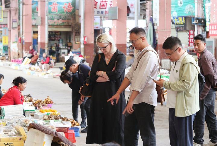 外国游客探访云南木水花野生菌交易中心。记者 杨峥 摄