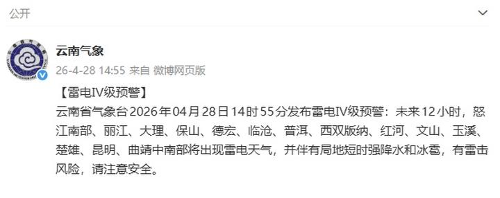据云南省气象局官方微博@云南气象 消息,云南省气象台2026年04月28日14时55分发布雷电Ⅳ级预警:未来12小时,怒江南部、丽江、大理、保山、德宏、临沧、普洱、西双版纳、红河、文山、玉溪、楚雄、昆明、曲靖中南部将出现雷电天气,并伴有局地短时强降水和冰雹,有雷击风险,请注意安全。
