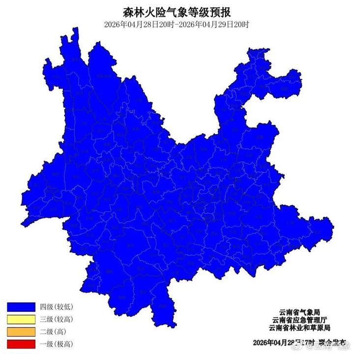 2026年4月28日20时至2026年4月29日20时,全省四级(较低)。