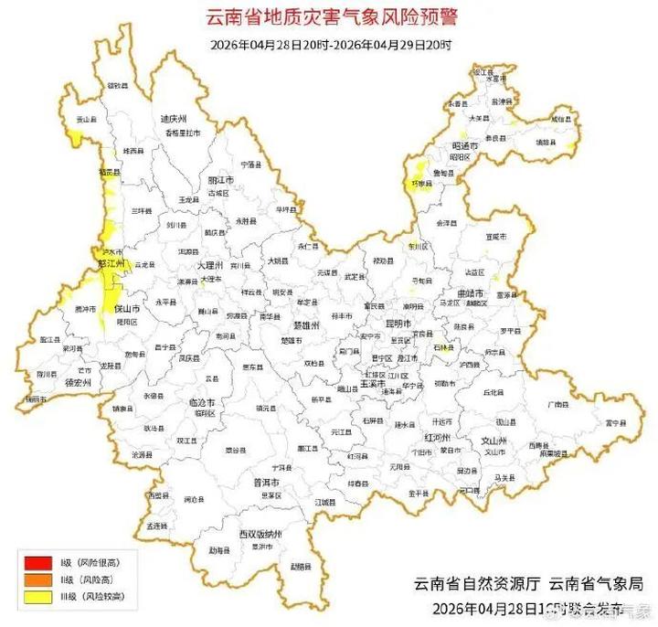 2026年04月28日20:00~04月29日20:00,昆明市北部、东南部,昭通市东部和中部、西南部,曲靖市东部,保山市北部,大理州中部和西部,怒江州北部、中部至南部发生滑坡泥石流的风险较高。