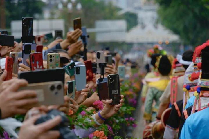 4月14日,西双版纳州景洪市街头,游客纷纷举起手机拍摄民族民间文化大游演。新华社发(萧橡 摄)