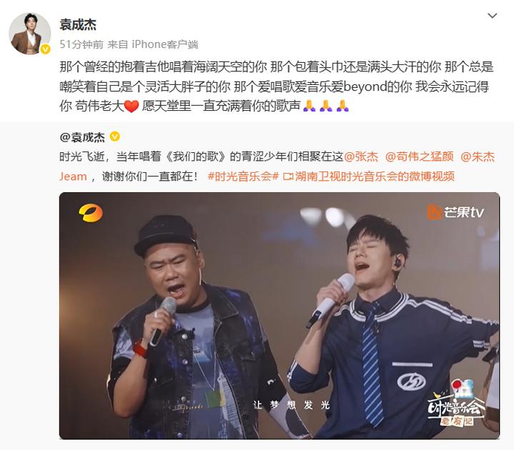歌手、演员袁成杰发文悼念苟伟:那个曾经的抱着吉他唱着海阔天空的你,那个包着头巾还是满头大汗的你,那个总是嘲笑着自己是个灵活大胖子的你,那个爱唱歌爱音乐爱beyond的你,我会永远记得你,苟伟老大。