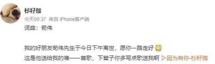 5月7日凌晨,音乐人卢世伟在微博透露收到歌手苟伟去世的消息,“对他最深刻的印象,还停留在2004年跟张杰合作《北斗星的爱》那会儿。”歌手杉籽伽也证实,苟伟于5月6日下午离世,时年44岁。