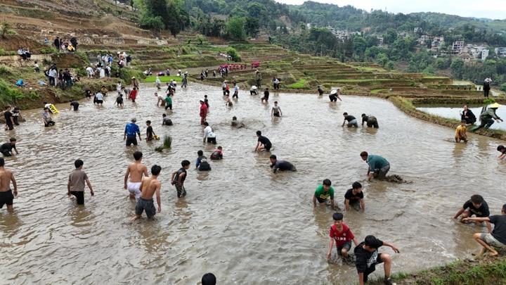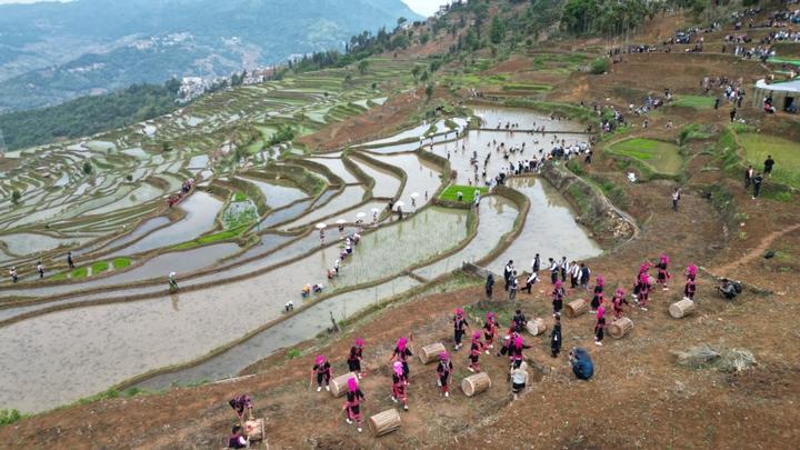“开秧门”是哈尼族的传统农耕文化活动,寓意着一年农事的开始。在红河县甲寅镇十二龙泉梯田,哈尼族传统“开秧门”仪式正式开始,哈尼族人以田埂为舞台,山水为背景,展现独特的农耕文化。游客们不仅欣赏到了美丽的梯田风光,还参与了插秧、抓鱼等活动,体验传统农耕的乐趣。