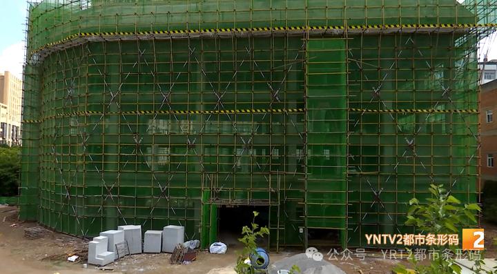 上午10点,记者在现场看到,整栋建筑已经搭上了脚手架,外立面被绿色安全网包裹着。透过安全网可以看到,楼内外堆放着不少建筑材料,三五名工人正在楼内工作。