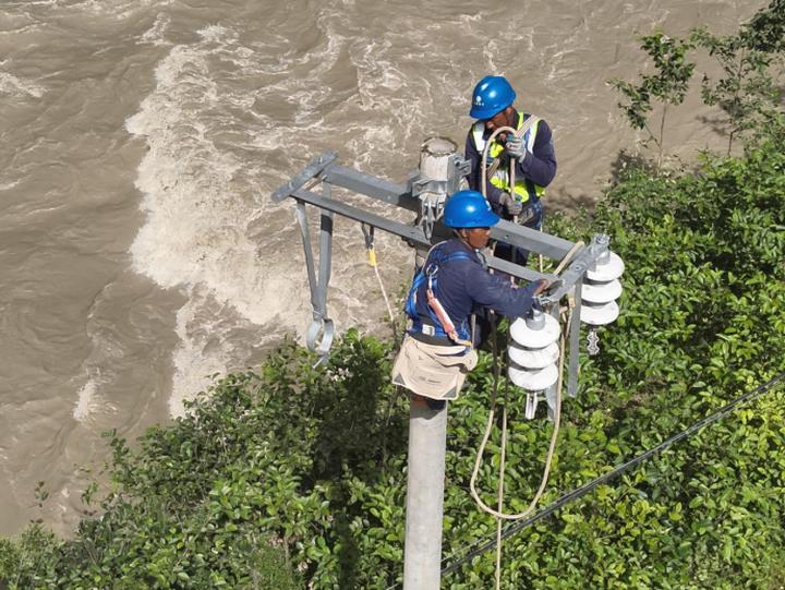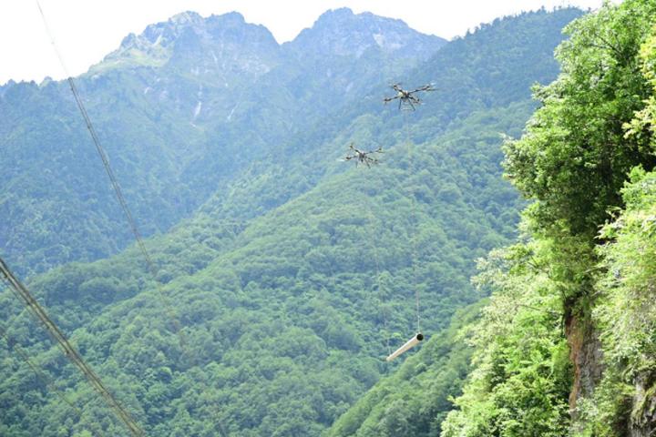 危急关头,一项创新方案被果断拍板:向天空“借路”。在南方电网通用航空有限公司帮助下,调用载重能力达250公斤的大型无人机。这条由钢铁之翼构筑的“空中生命线”,成为打破孤岛困境的希望。6月初的独龙江峡谷,天气瞬息万变,气流复杂湍急。每一次起飞,都是技术与勇气的双重考验。成箱的方便食品、瓶装饮用水、急救药品,稳稳落在受灾村寨的空地上;成捆的崭新20千伏导线、金具、绝缘子等,被安全送达峭壁上急需的抢修点;甚至那些数米长的电杆,也被巧妙地固定在吊索下,穿越云层,稳稳投向预定坐标。