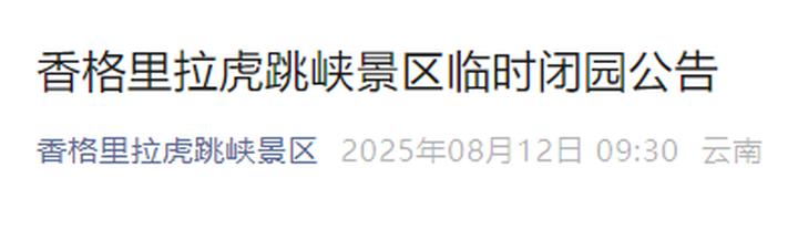 由于强降雨天气,旅游东环线公路沿线落石等地质灾害的气象风险较高。为确保旅游安全,经迪庆州香格里拉虎跳峡旅游经营有限公司研究决定,2025年8月12日香格里拉虎跳峡景区暂停营业。具体开园时间另行通知,给各旅行社及广大游客朋友带来不便敬请谅解!