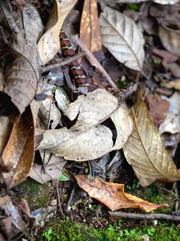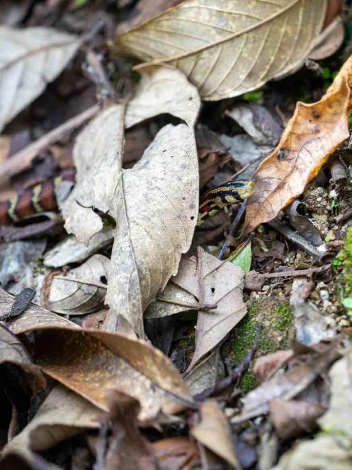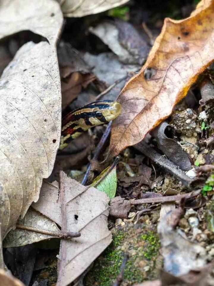 “突然回头就看见它了。”近日,赵海璇在临沧澜沧江省级自然保护区参与调查监测时,偶遇了方花蛇。他告诉记者,当时他们行经山林边缘的小路时,路旁的落叶堆隐约透出几点橘红与鹅黄。小家伙仿佛感知到有客来访,从落叶堆里探出一个椭圆的小脑袋,清澈的大眼睛仿佛正在表达疑惑。