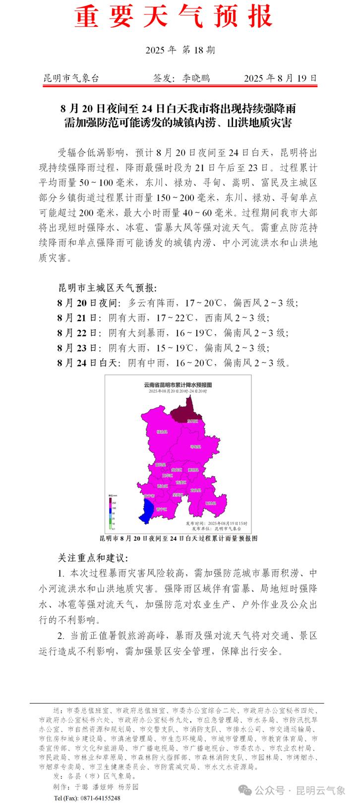 19日,昆明发布重要天气预报预计8月20日夜间至24日白天