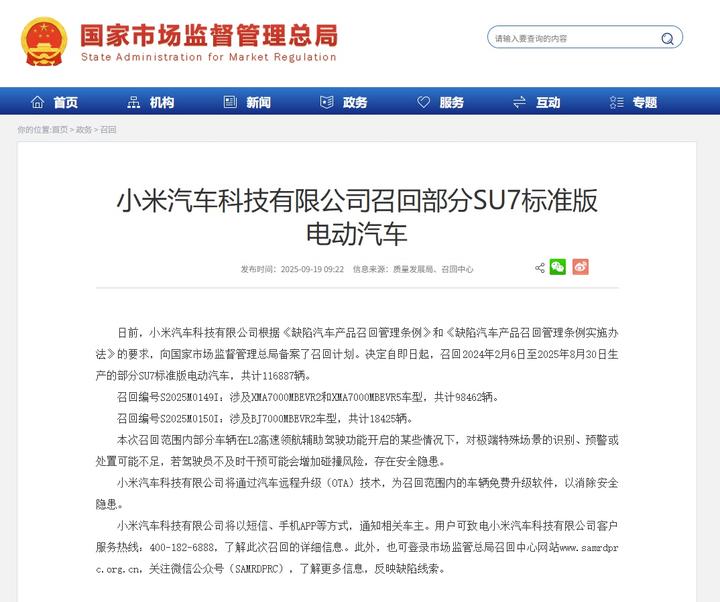 日前,小米汽车科技有限公司根据《缺陷汽车产品召回管理条例》和《缺陷汽车产品召回管理条例实施办法》的要求,向国家市场监督管理总局备案了召回计划。决定自即日起,召回2024年2月6日至2025年8月30日生产的部分SU7标准版电动汽车,共计116887辆。