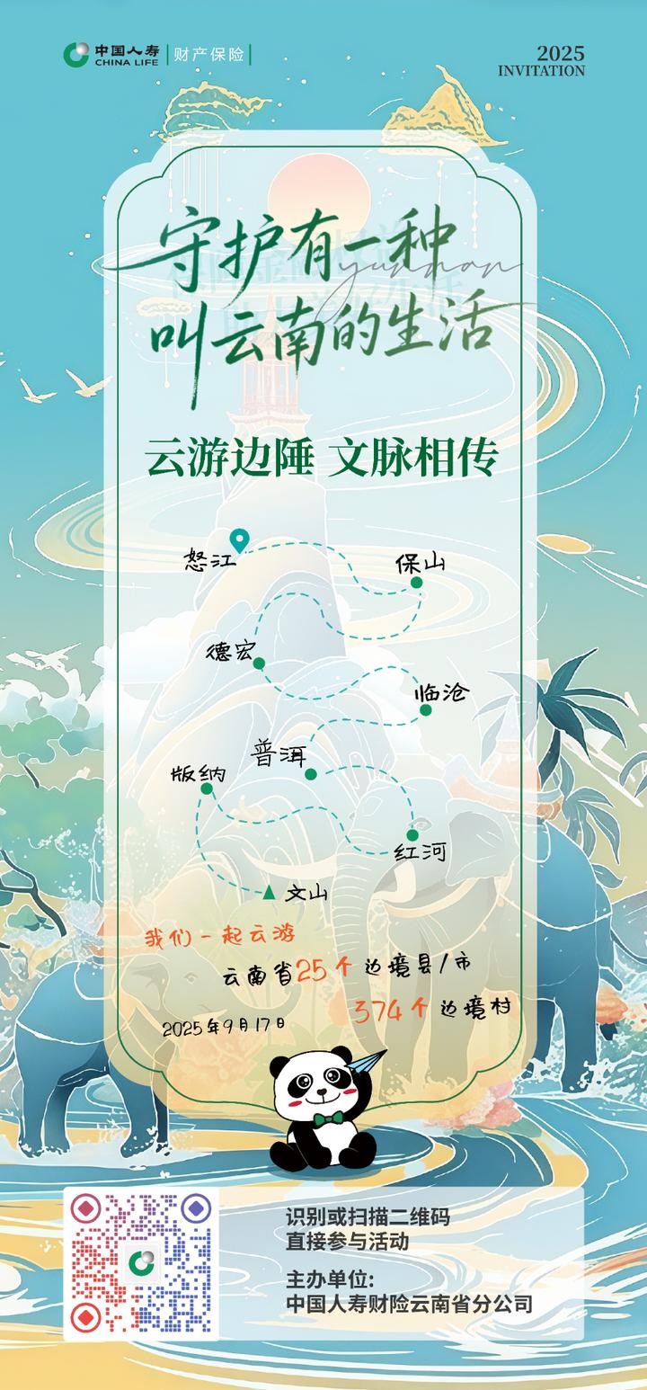 活动时间为2025年9月17日—2025年12月底,可扫描海报二维码或点击“中国人寿财险云南分公司”微信公众号菜单栏“云游边陲 文脉相传”参与游戏。