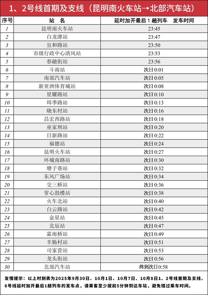 为方便晚间抵昆旅客的顺利出行,做好高铁站、机场的地铁运输接驳工作,昆明地铁将在以下日期延长运营服务时间:9月30日、10月1日、10月7日、10月8日。