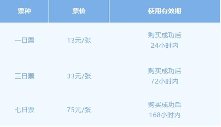 电子日票:支付宝APP购买,立即生效,一日票13元、三日票33元、七日票75元,不支持充值。