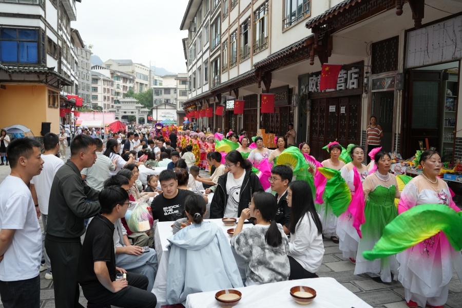 从四川内江远道而来的朱仁彬一家津津有味地品尝着地道风味。“国庆假期带家人来旅游,恰逢这场长街宴,不仅尝到了正宗的地方美食,更感受到了威信淳厚的民风。”他笑着说,“希望更多游客来此体验,也祝愿祖国更加繁荣昌盛!”